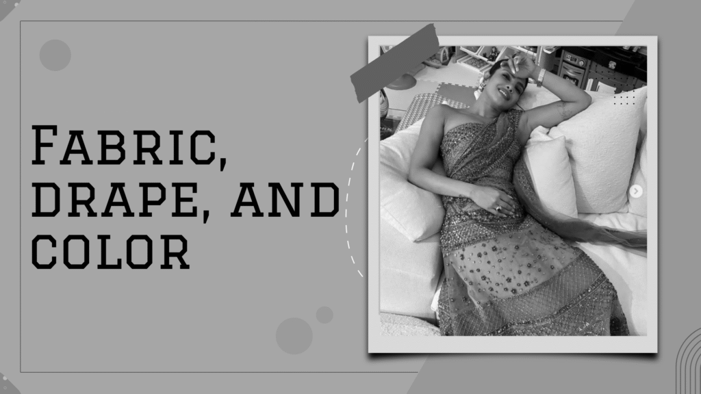 Fabric choice matters: a luxe satin or silk blend can enhance the drape and create the subtle sheen that catches light on the red carpet. A jewel-tone palette or a neutral, moonlit hue can let the silhouette speak while ensuring the look photographs with depth. The sari-inspired silhouette often relies on clean lines at the bodice with generous, controlled volume in the lower half, creating a regal, elongated silhouette. Priyanka Chopra Jonas sari-inspired Elie Saab embraces this balance by pairing architecture with softness, allowing movement without sacrificing structure. The color choice also communicates mood—cool metallics for a futuristic glow or deeper gems for a ceremony-ready aura, both of which suit a gala setting.